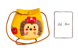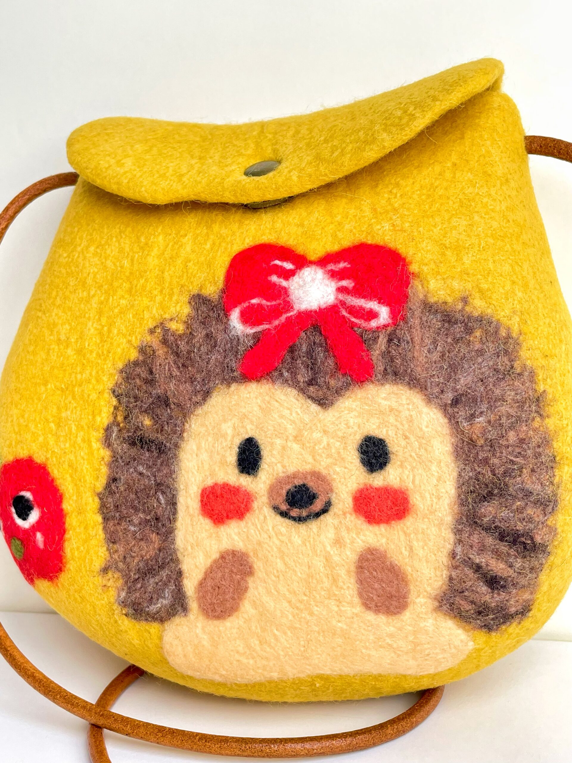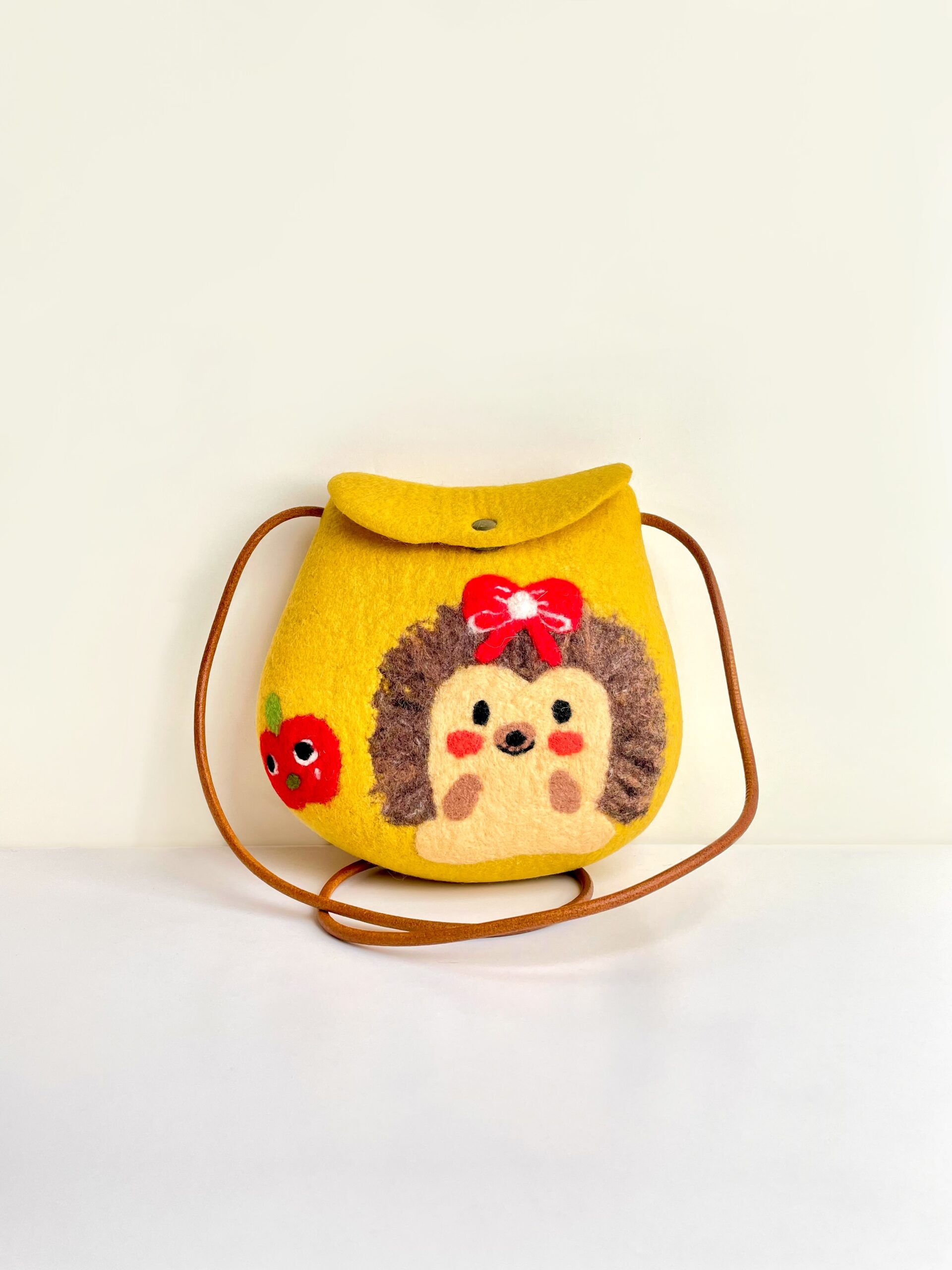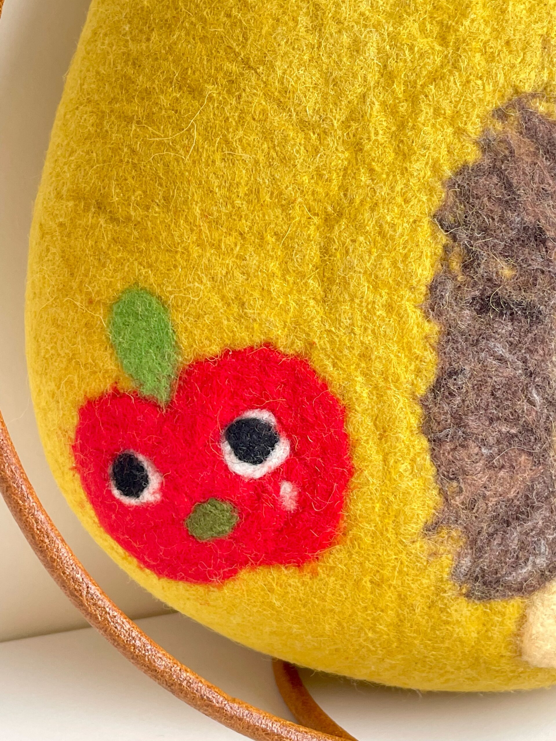 Crafted with a bright palette of golden yellow wool, the bag features our hedgehog friend with blushing cheeks, a red bow, and her cheerful apple companion.