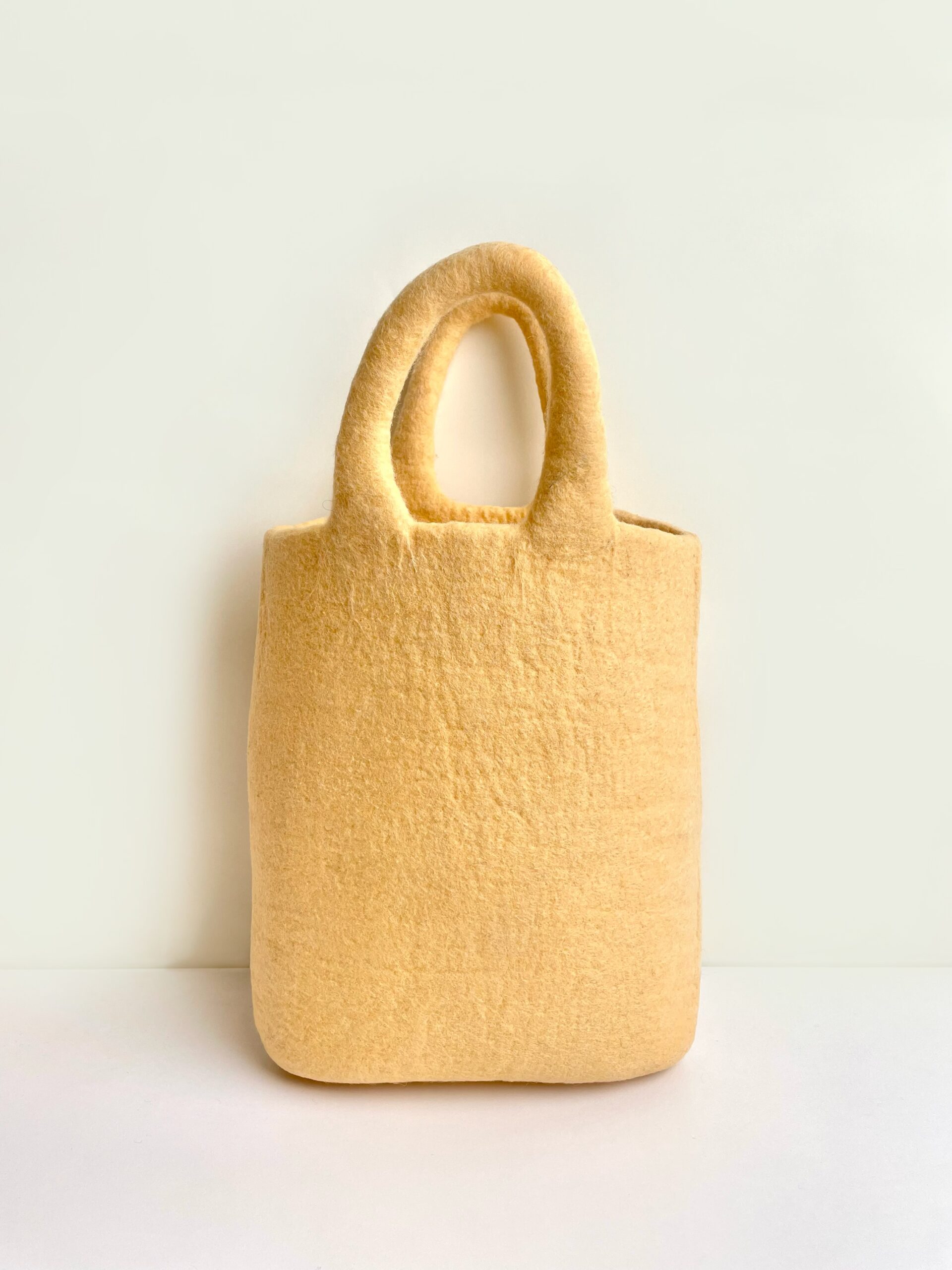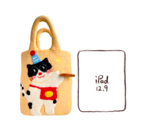 Meet Rosie Cat, our hand-felted wool bag character with rosy cheeks, a red nose, and a blue hat tipped with a pom-pom. In her bright red apron with a golden circle, she bustles about like a tiny chef, carrying trays and asking sweetly how everything tastes. When evening comes, Rosie curls up in her cozy corner, smiling as the stars twinkle above, and softly wishes the world sweet dreams.