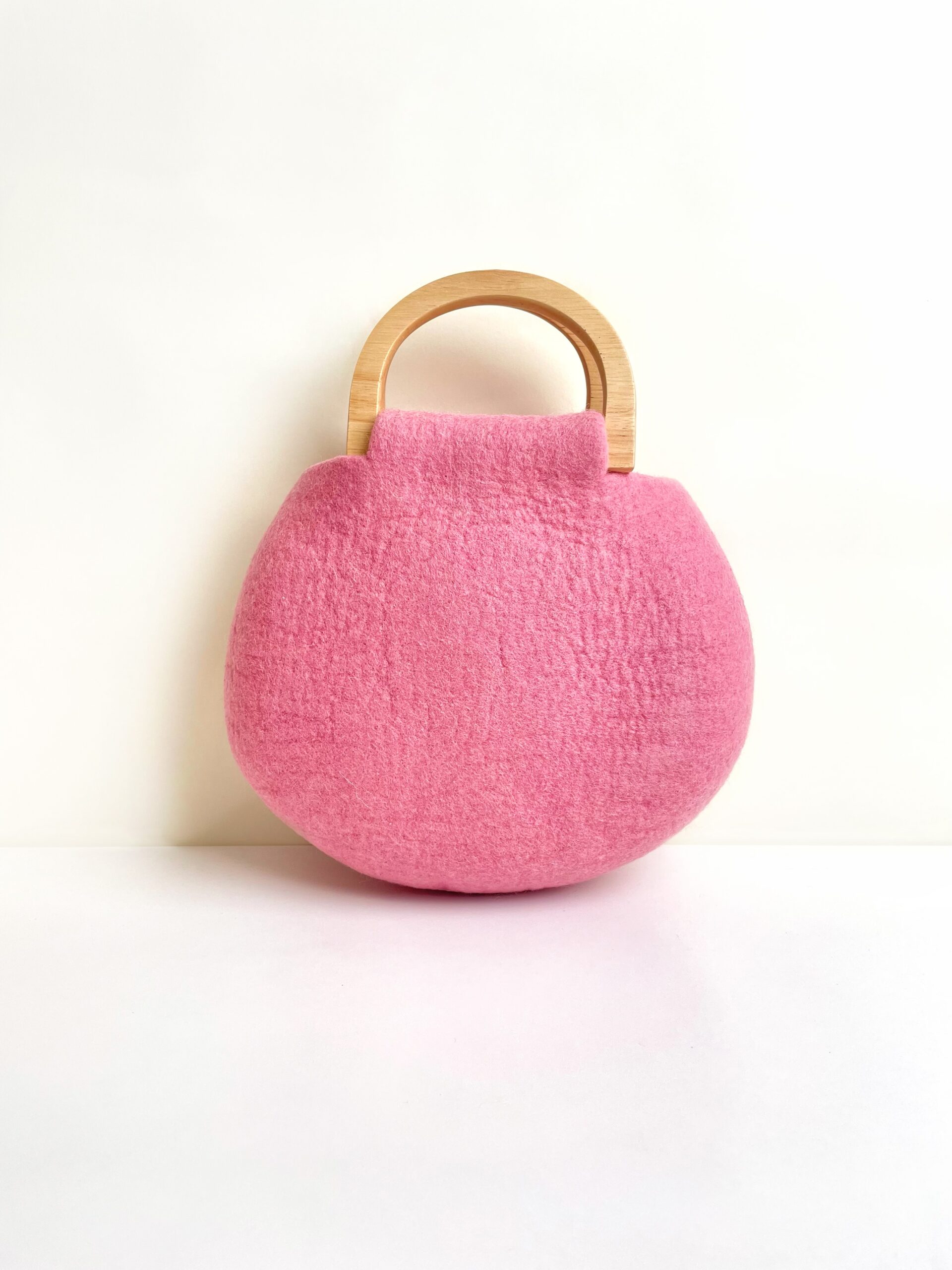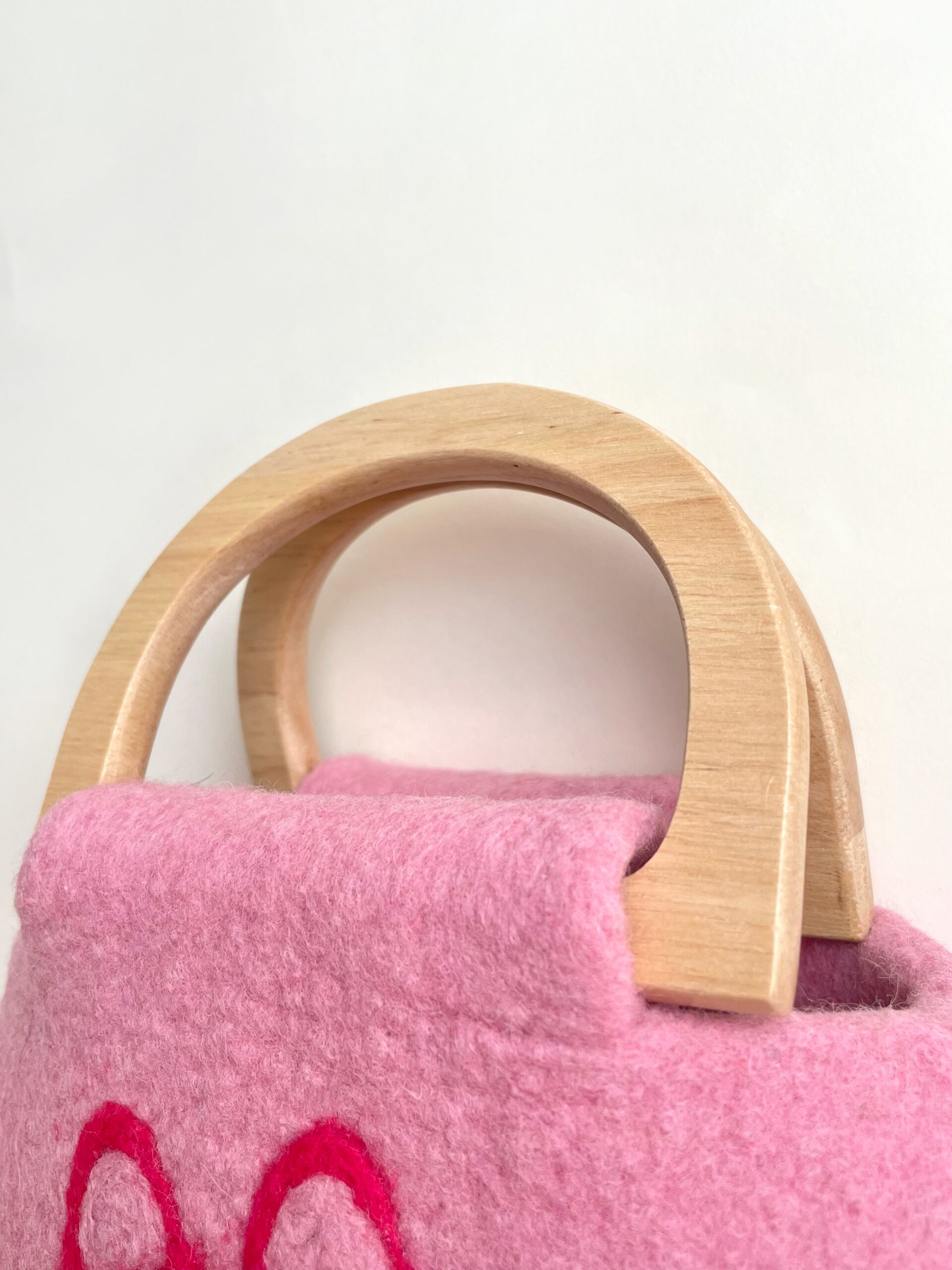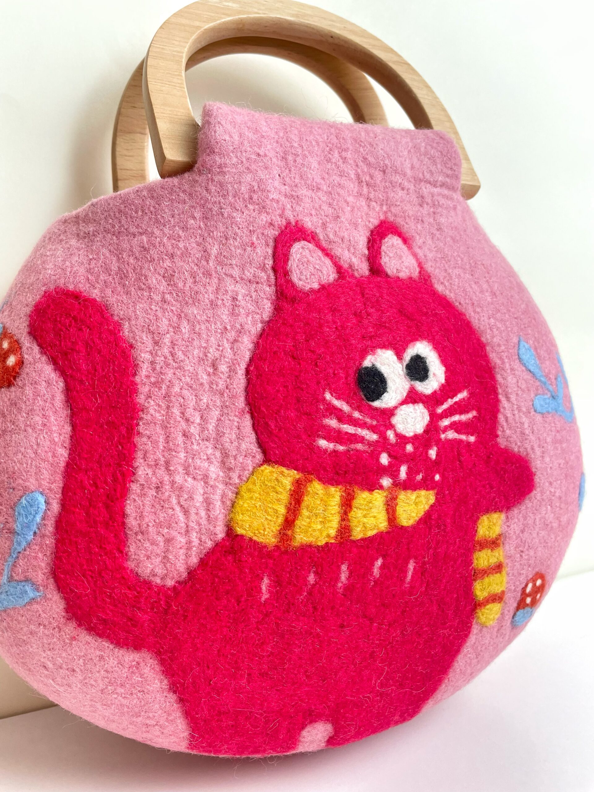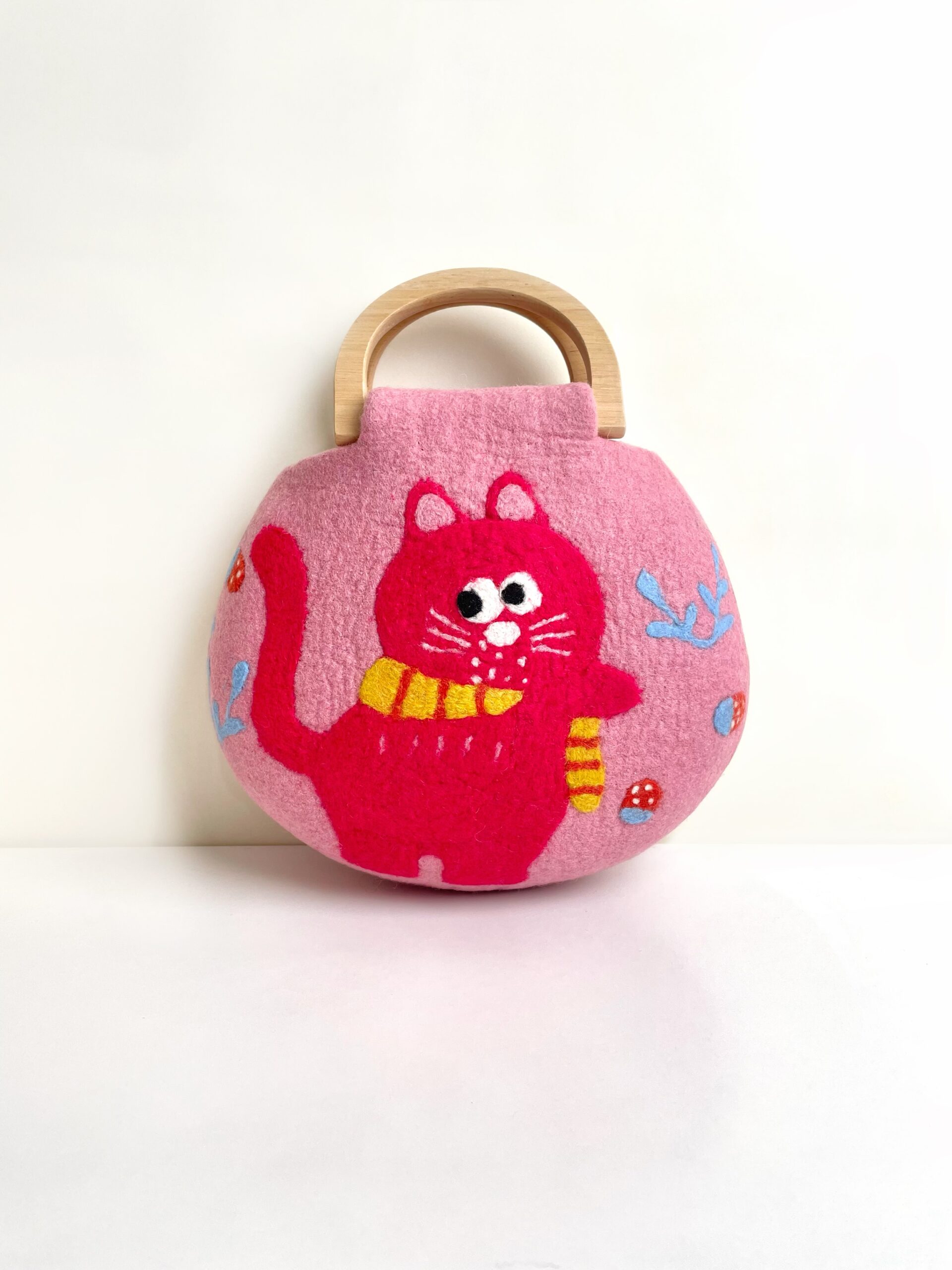 Meet the Strawberry Dream Kitten – a rosy-pink cat with a yellow-and-red striped scarf, who loves following her girl into the garden. After a day of strawberry picking, she curls beside a brimming basket, dreaming of fruit and coral charms that float and twirl in the air. Hand-felted in wool with whimsical details, this storybook bag carries the sweetness of summer and the magic of dreams.